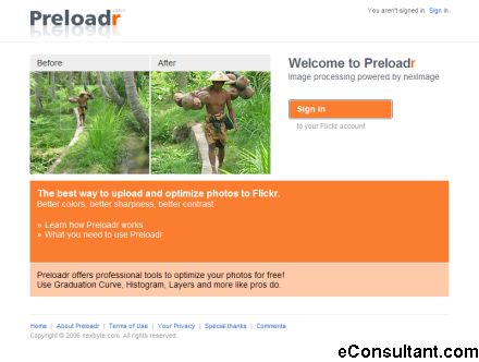 editor de fotos online pensado para Flickr, y eso que ha sido desarrollado para que puedas editar tus fotos almacenadas en Flickr. Por ello, necesitas acceder con tus datos de Flickr para usar Preloadr. Elige la foto a editar y prepárate para un sistema de edición básico, sin sorpresas ni alegrías (lo clásico: brillo, color, saturación, etc.). Lo único positivo es que se integra bastante bien a Flickr y hace uso de filtros predefinidos.
